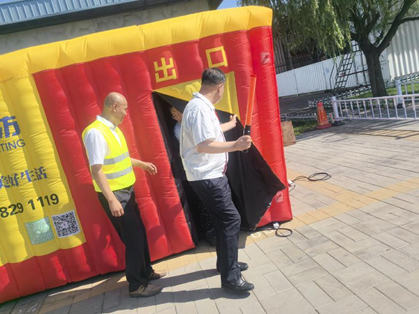 3、在模擬黑暗濃煙環境的逃生屋演練中,參訓人員10人一組,所有人員手肩相連,整齊有序分批體驗真實火場逃生,強化心理素質。